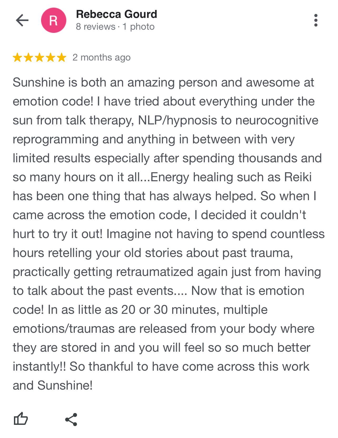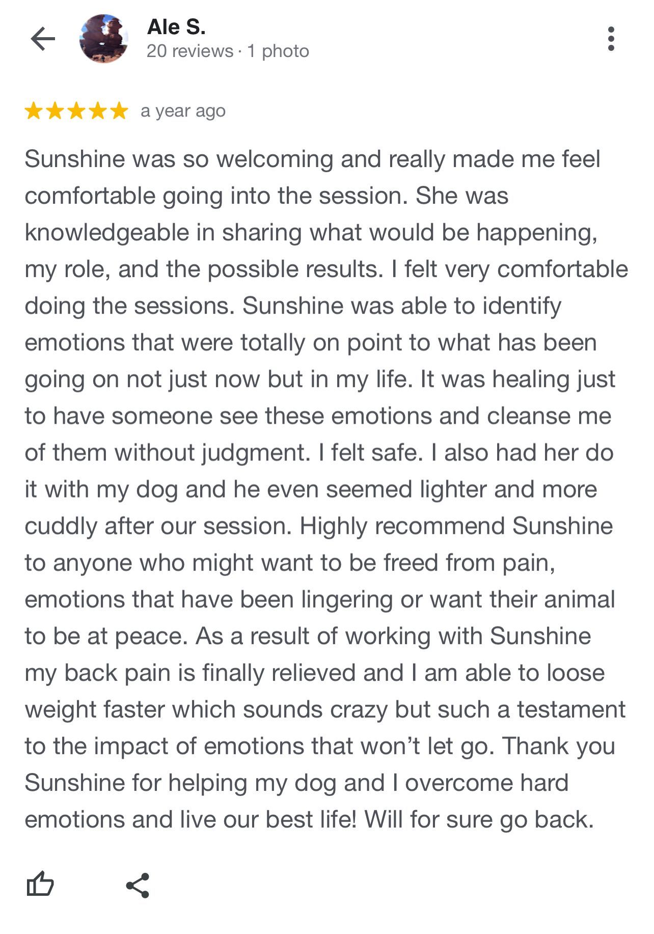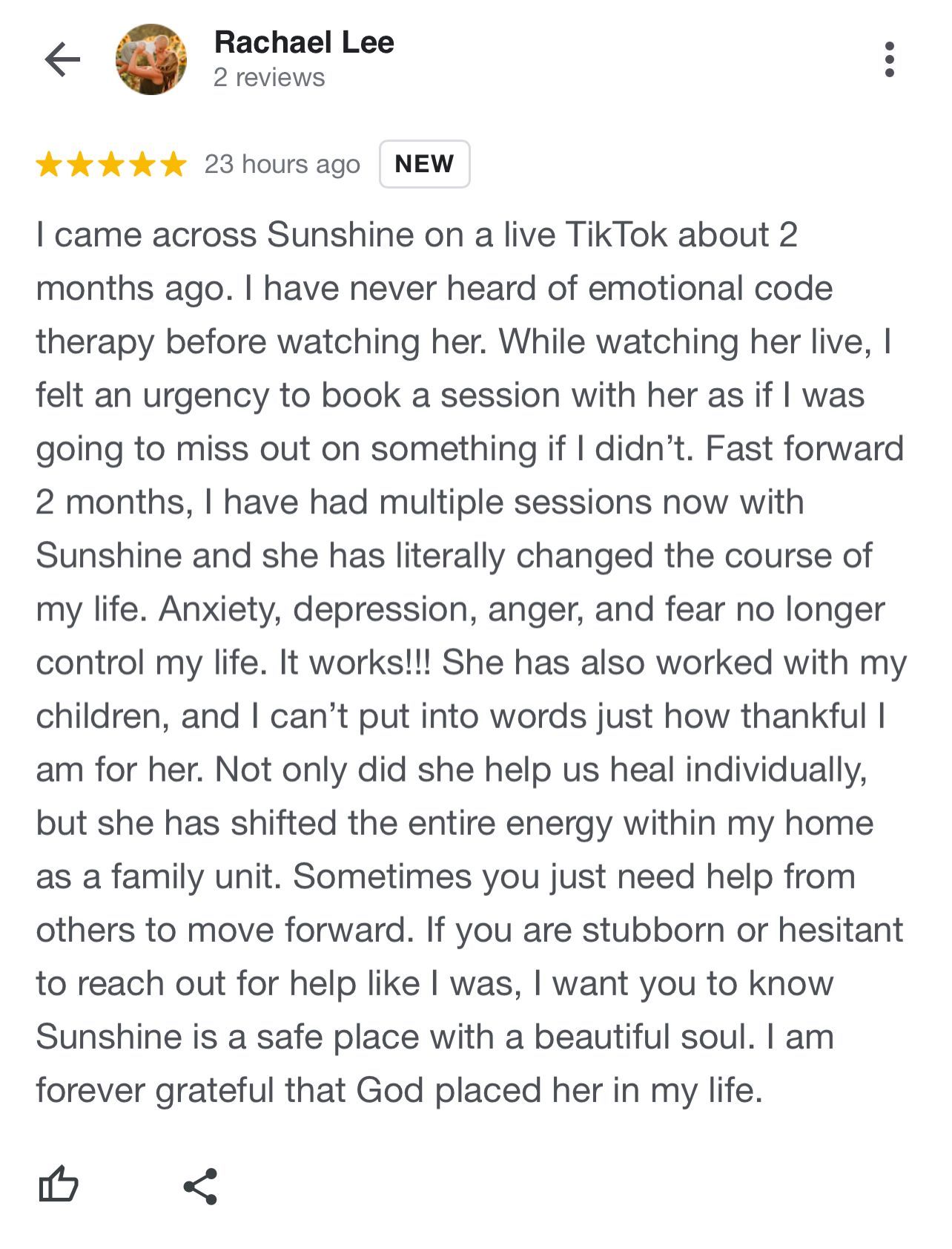"I had a great experience with Sunshine. Her passion during our sessions were apparent and I left each time feeling less stressed and healed. She was able to identify emotions that I had been holding onto for most of my life and help me release them so that I was not burdened by them any longer. I love how Sunshine creates a warm, comfortable and welcoming environment during our sessions, and I would recommend her services to any and everyone.